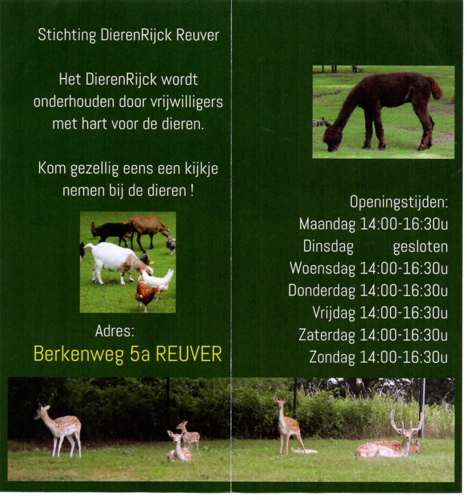 Kom je wel eens bij het Dierenrijck aan de Berkenweg in Reuver? Het mooi aangelegde dierenverblijf is onlangs van beheerder gewisseld en wordt geheel onderhouden door vrijwilligers. Ga snel eens een kijkje nemen, want het park is een mooie voorziening in onze gemeente. Genieten van de dieren en even tot rust komen in de groene – binnenkort herfstachtige – omgeving. Kernoverleg Reuver draagt het park al jaren en warm hart toe en zal dit ook in de toekomst graag blijven doen. En natuurlijk werken we samen: het park is een vast onderdeel van de Kribkes-/lichtjestocht in december, als het grote binnenverblijf is veranderd in een levende kerststal!